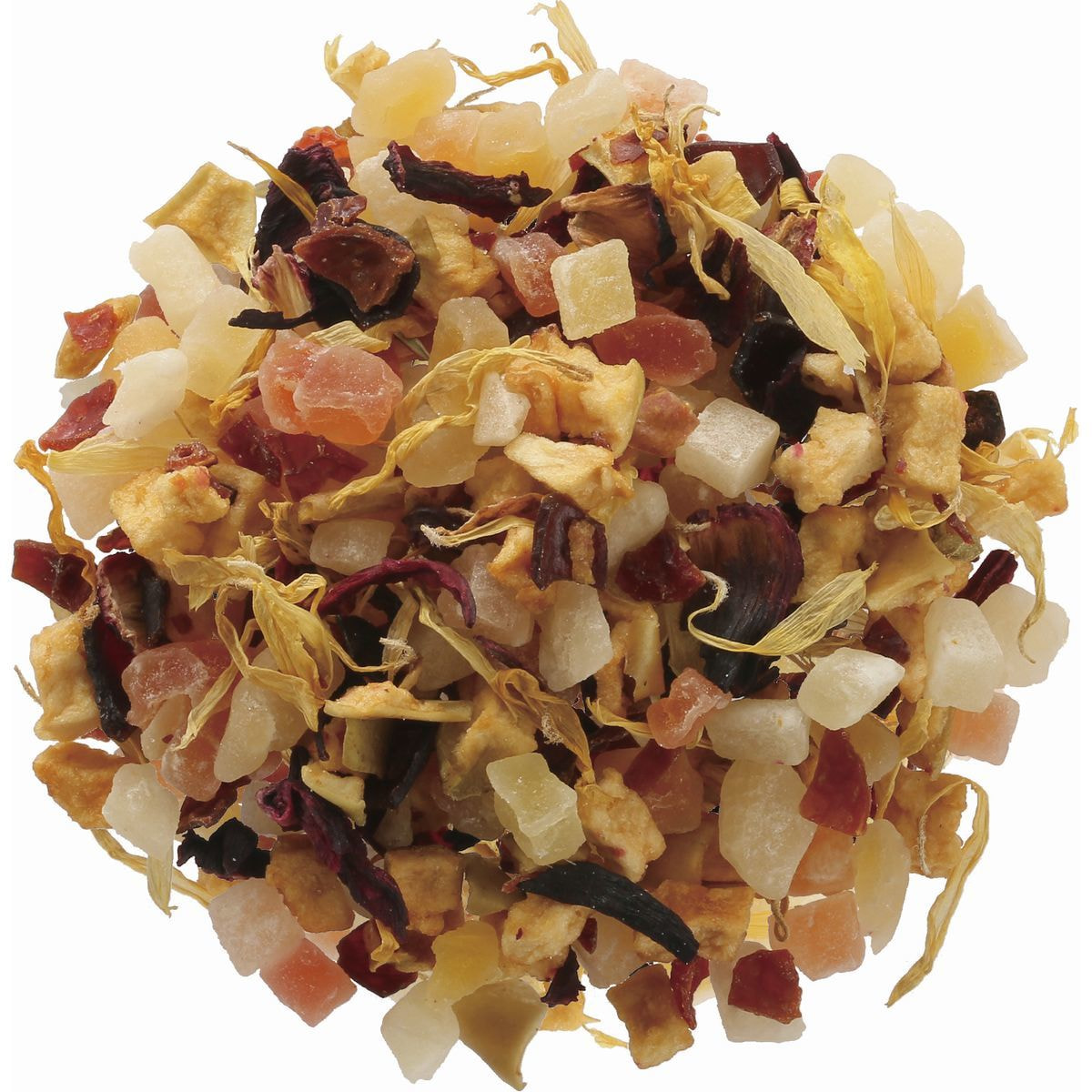 加糖ドライパパイヤ(タイ製造)、加糖ドライメロン、加糖ドライマンゴー、有機ドライアップル、有機ドライアプリコット、有機ハイビスカス、有機マリーゴールド、有機米粉/香料、クエン酸、保存料(亜硫酸塩)